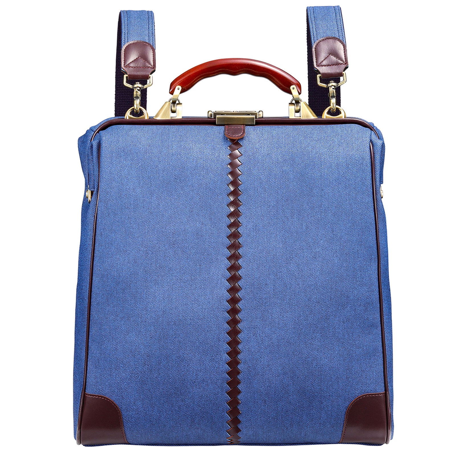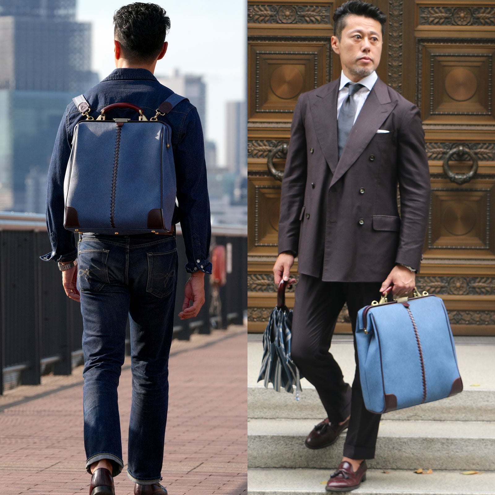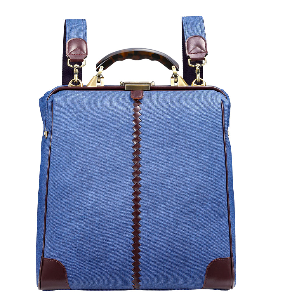 レザー部分はバーガンディでカジュアルな印象のデニムをビジネスシーンでも上品に演出。ハンドルは木目の美しい天然木でゴールドの金具と合わせてアンティークな仕上がり。休日のデニムスタイルでも、仕事のクールビズスタイルにもどちらも合わせやすい逸品。