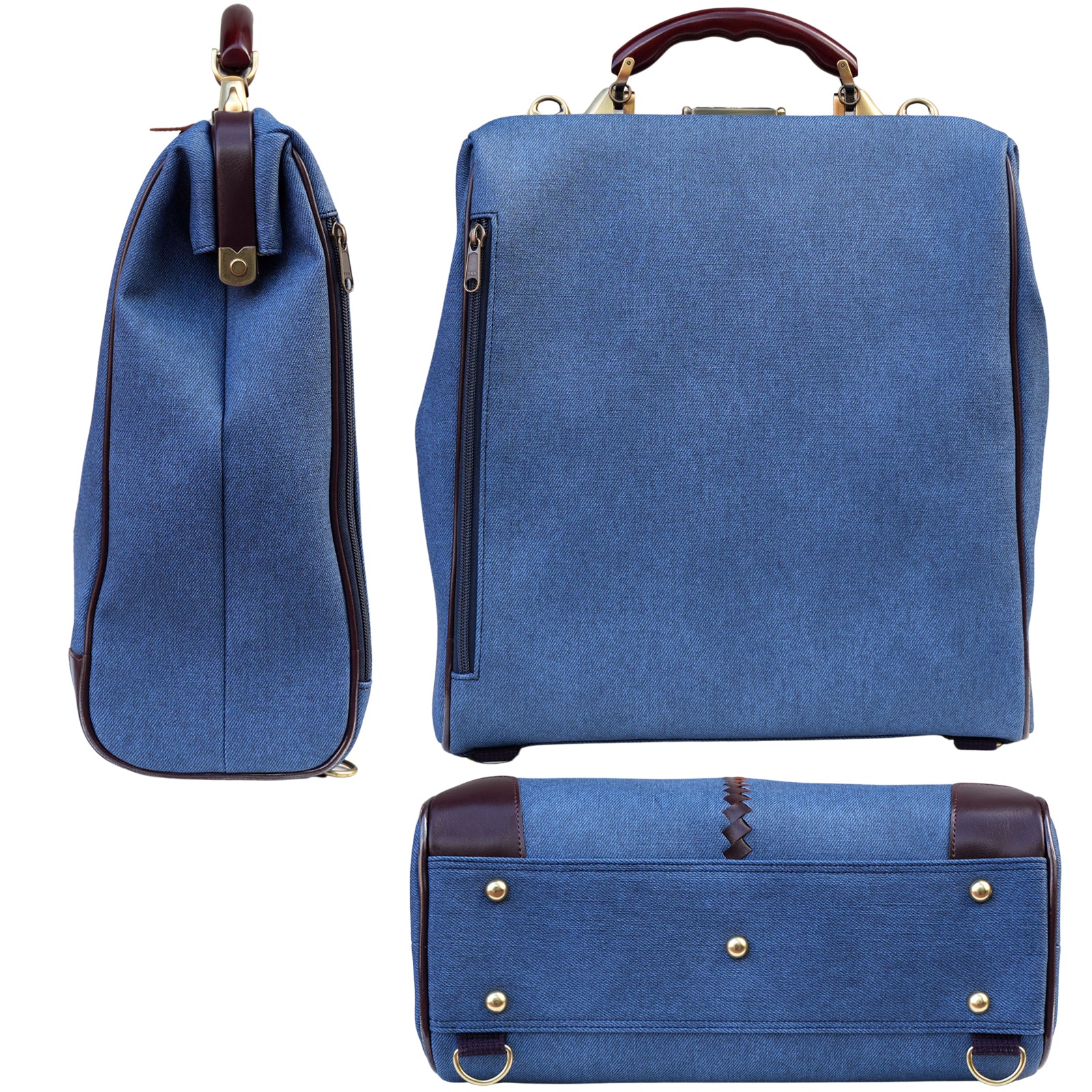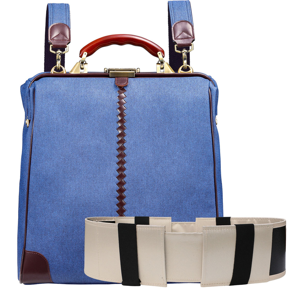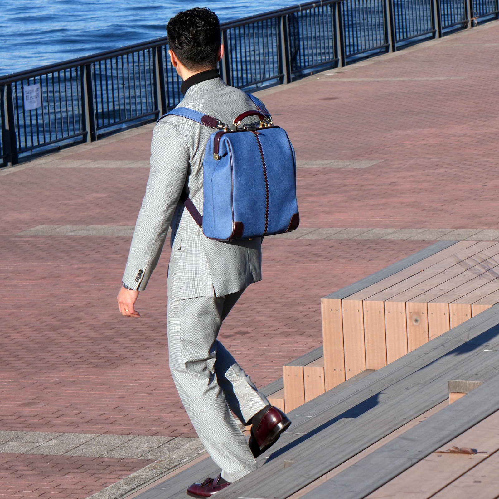 レザー部分はバーガンディでカジュアルな印象のデニムをビジネスシーンでも上品に演出。ハンドルは木目の美しい天然木でゴールドの金具と合わせてアンティークな仕上がり。休日のデニムスタイルでも、仕事のクールビズスタイルにもどちらも合わせやすい逸品。
