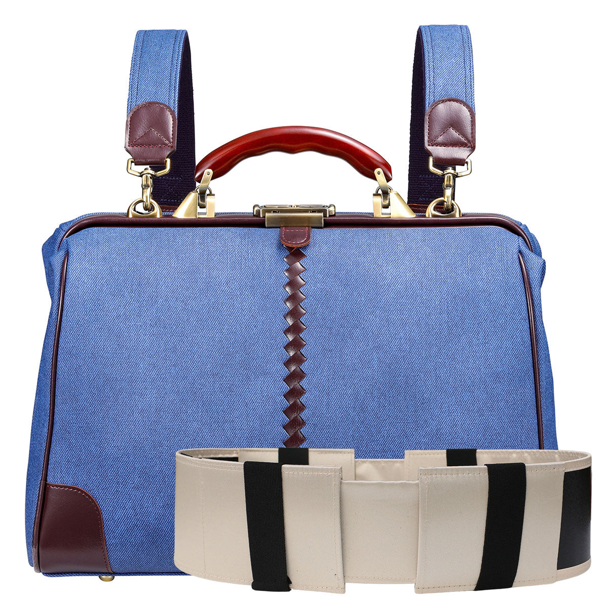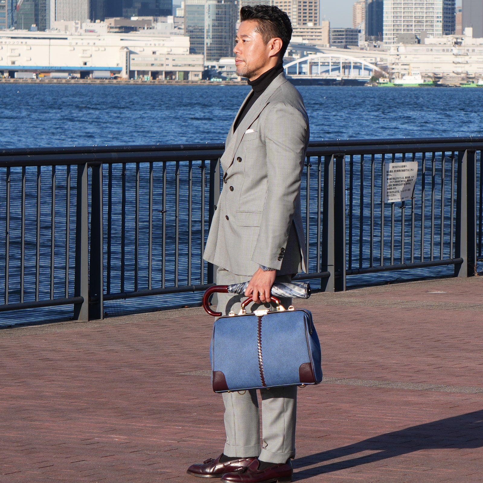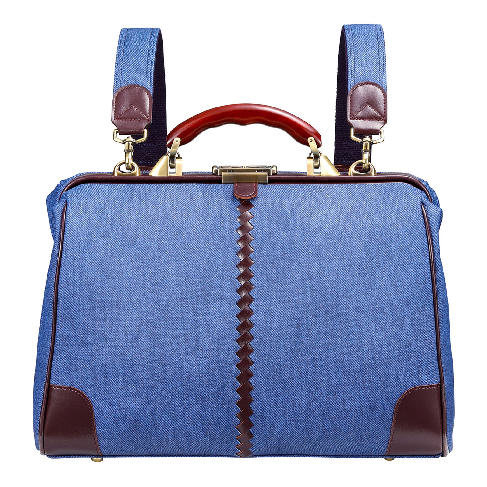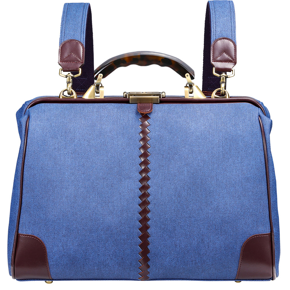レザー部分はバーガンディでカジュアルな印象のデニムをビジネスシーンでも上品に演出。ハンドルは木目の美しい天然木でゴールドの金具と合わせてアンティークな仕上がり。休日のデニムスタイルでも、仕事のクールビズスタイルにもどちらも合わせやすい逸品。