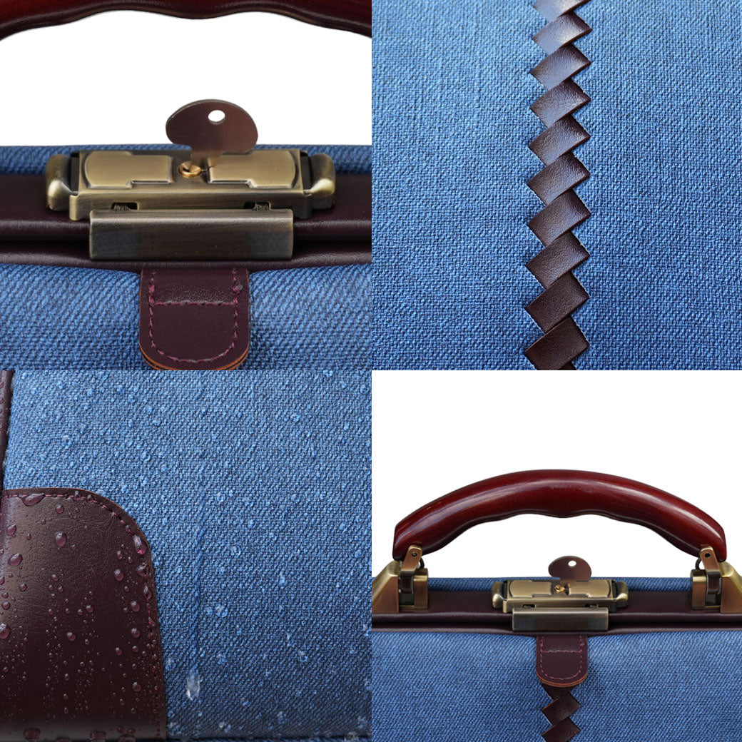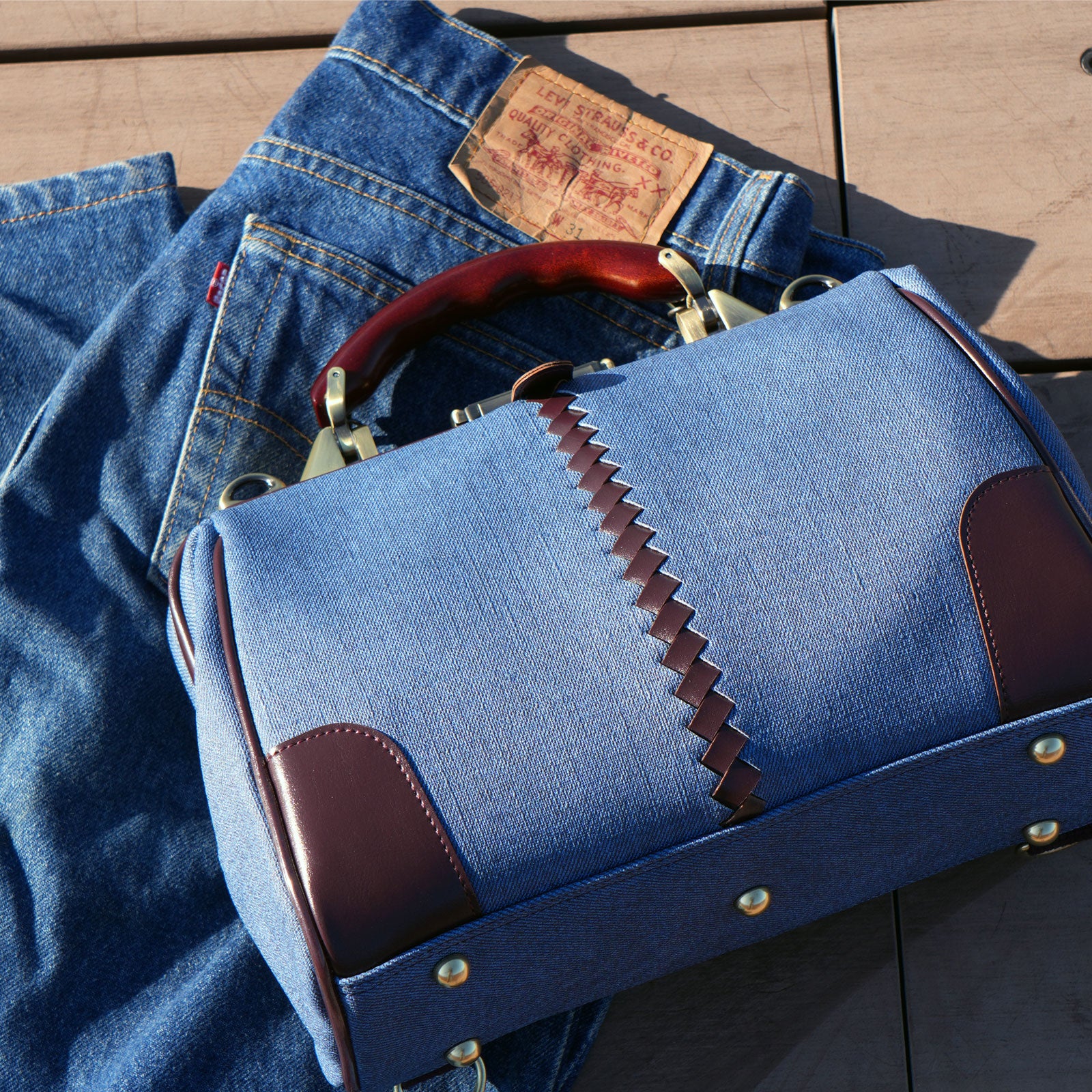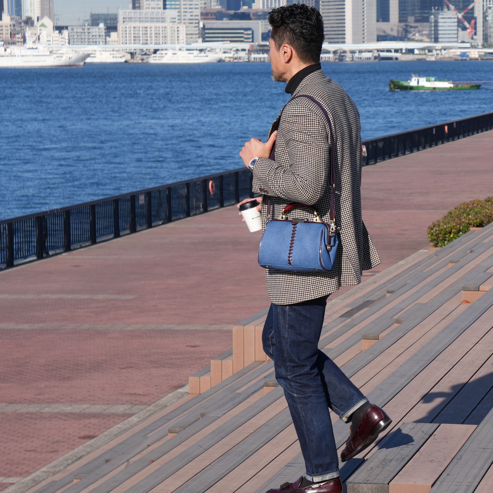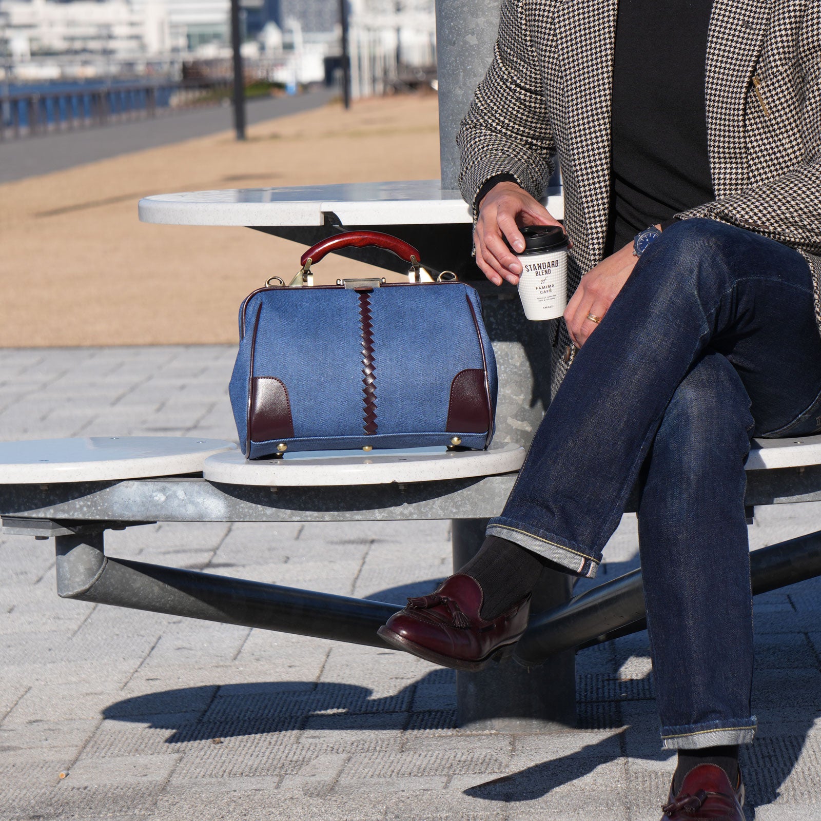 レザー部分はバーガンディでカジュアルな印象のデニムをビジネスシーンでも上品に演出。ハンドルは木目の美しい天然木でゴールドの金具と合わせてアンティークな仕上がり。休日のデニムスタイルでも、仕事のクールビズスタイルにもどちらも合わせやすい逸品。