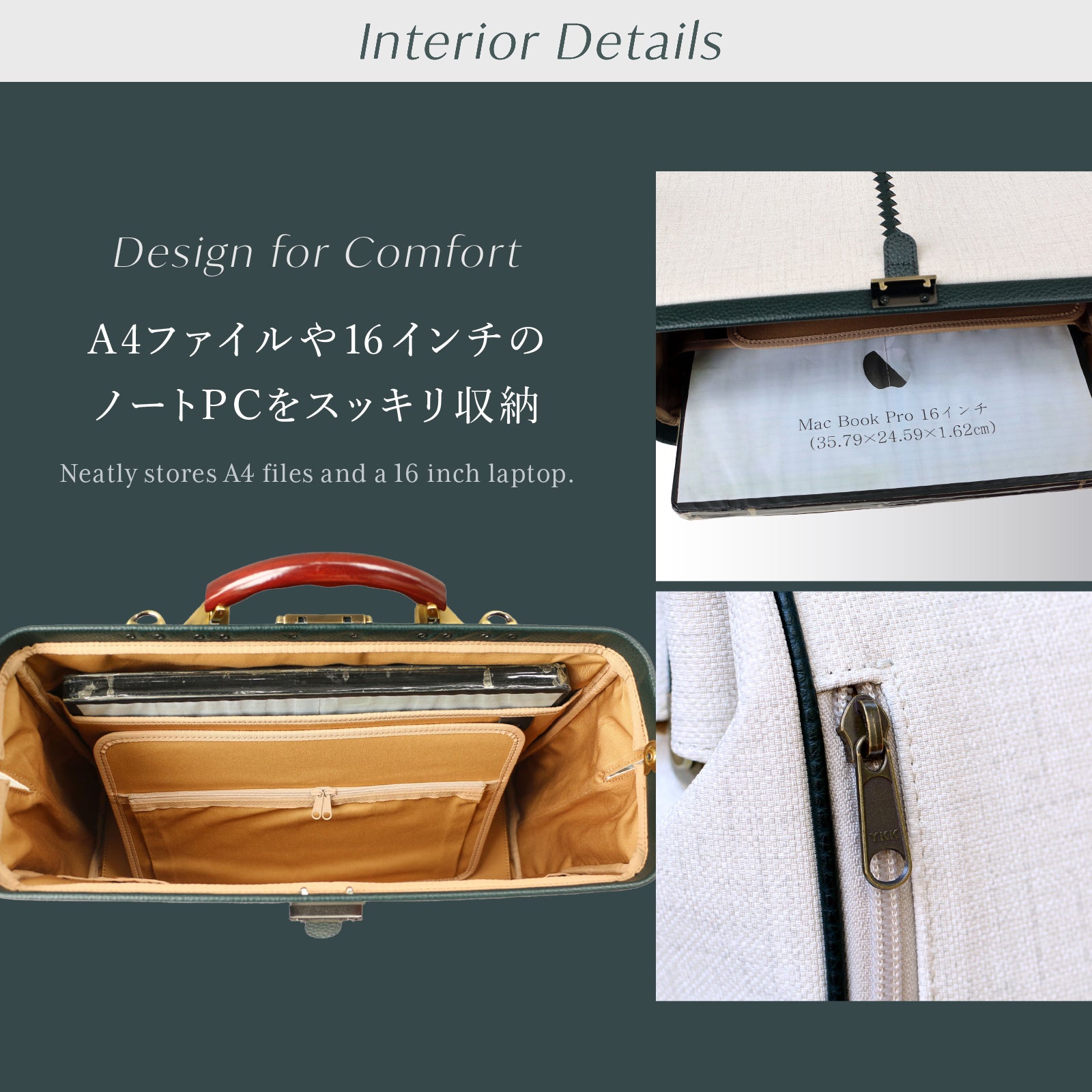 そして見た目以上に軽いのが魅力。レザー部分はYOUTAのブランドカラーでもあるダークグリーンです。