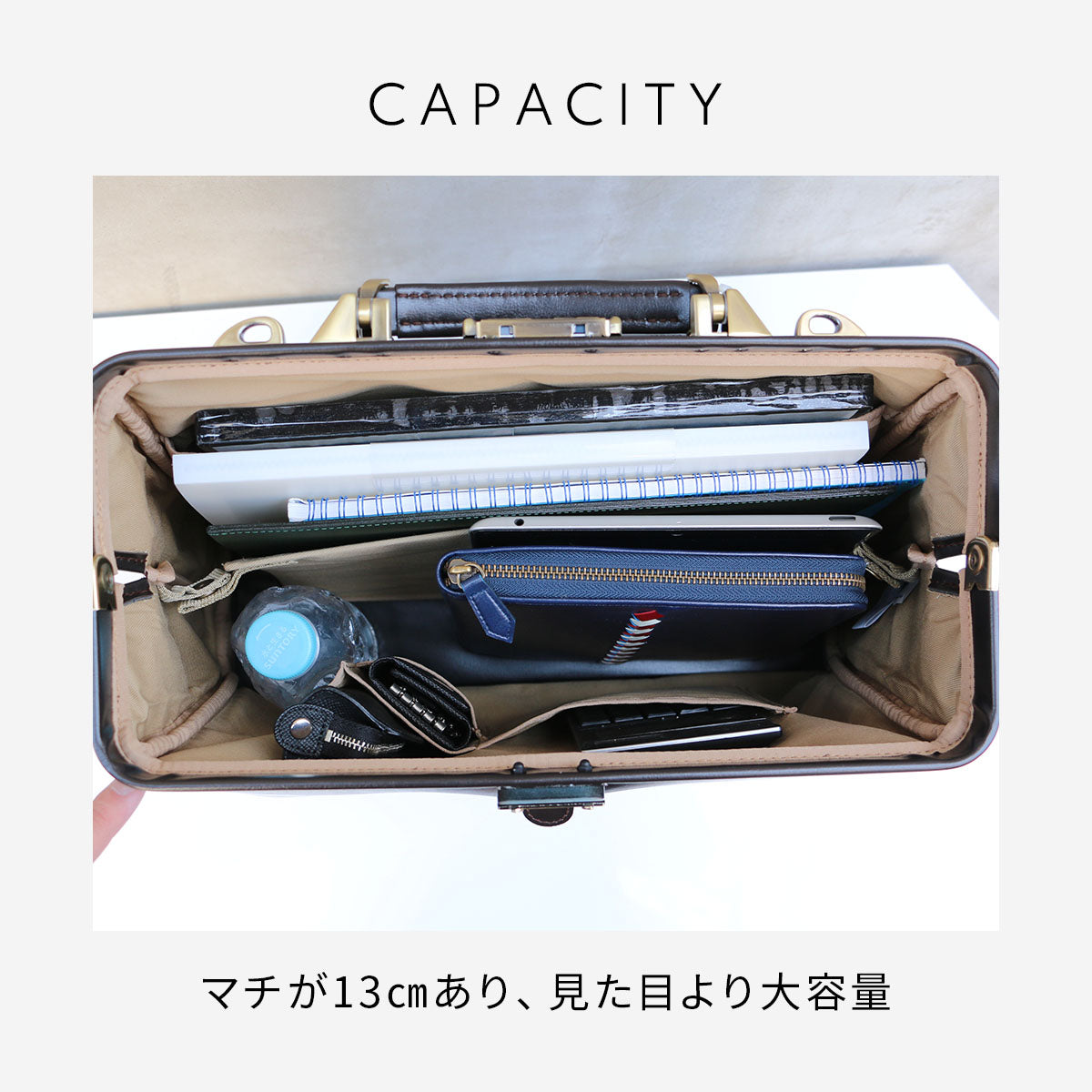 ダレスバッグの大きく開くフレームはPCや書類も取り出しがスムーズ。