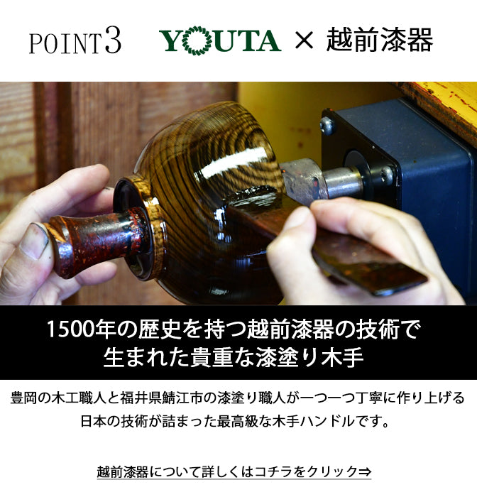 ハンドルには木目が美しい国産ケヤキ材に透明な漆を塗り重ね、木目が透けて見える「木地呂塗り」で仕上げたハイエンドモデル。使い込むと木目が際立ち、デニムのような経年変化を楽しめます。