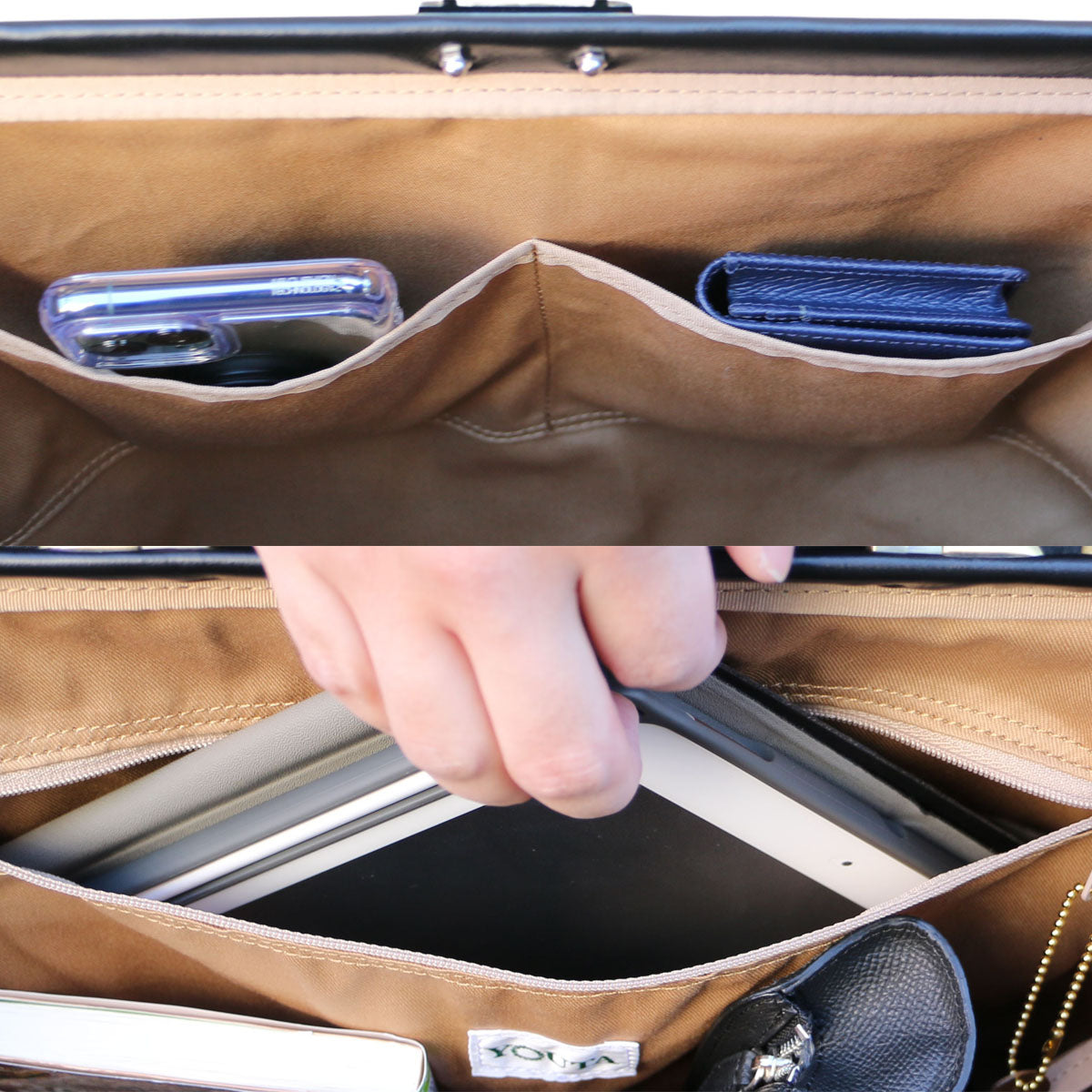 ダレスバッグの大きく開くフレームはPCや書類も取り出しがスムーズ。